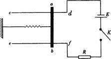 间有一匀强磁场.合上电键K,弹簧伸长2cm,测得电路中的电流强度为5A,已知弹簧的倔强系数为20N/m,ab长L=0.1m,求匀强磁场的磁感应强度的大小.