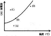 溶解度曲线上的每一个点代表溶液的一种状态.下图是某固态物质的溶解度曲线图.试判断该溶液在(A)、(B)、(C)、(D)四种状态中,属于不饱和溶液的是____,属于饱和溶液的是____.